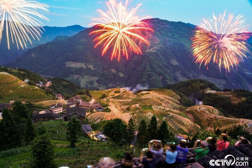 2023年6月10日,廣西桂林,龍勝龍脊梯田景區(qū)舉行一年一度的梳秧節(jié)。夜幕降臨,景區(qū)內(nèi)層層疊疊的梯田里星星點(diǎn)點(diǎn)的火把漸漸亮起,絢麗煙花在空中綻放,景色如畫。