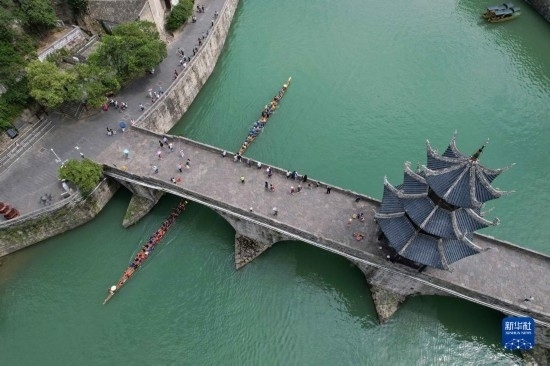 6月17日,游客在鎮(zhèn)遠古城 陽河畔體驗劃龍舟(無人機照片)。