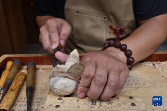 6月17日,一名手工藝人在鎮(zhèn)遠古城一家木雕店雕刻工藝品。