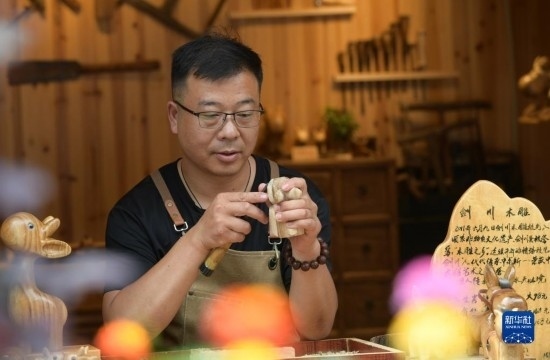 6月17日,一名手工藝人在貴州省鎮(zhèn)遠古城一家木雕店雕刻工藝品。