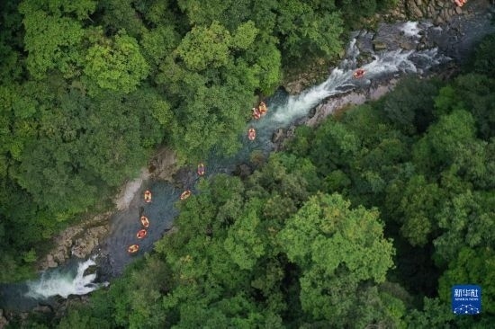 6月17日,游客在鎮(zhèn)遠縣高過河景區(qū)漂流(無人機照片)。