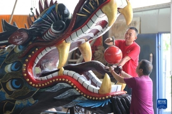 6月17日,藝人在鎮(zhèn)遠古城龍舟文化傳承基地制作龍頭。
