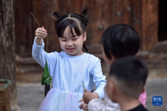 6月16日,小朋友在鎮(zhèn)遠古城 陽河畔體驗包粽子。