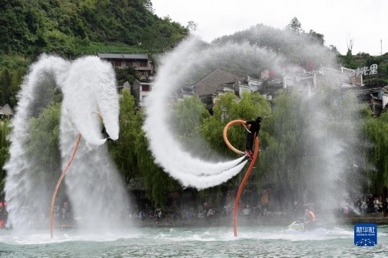 6月17日,工作人員在鎮(zhèn)遠古城 陽河畔進行水上飛人表演。