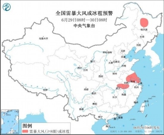 中央氣象臺6月29日06時繼續(xù)發(fā)布暴雨藍色預警和強對流天氣黃色預警:預計,6月29日08時至30日08時,黃淮南部、江淮、江漢中南部、江南北部、重慶東部以及黑龍江北部、內蒙古東北部等地部分地區(qū)有大到暴雨,其中,湖北東部等地局地有大暴雨(100~150毫米)。上述部分地區(qū)伴有短時強降水(最大小時降雨量30~50毫米,局地可超過70毫米),黑龍江中部、安徽中南部、江蘇中南部、上海西北部、湖北東部等地的部分地區(qū)將有8~10級雷暴大風或冰雹天氣,局地風力11級,江蘇中南部局地可能伴有龍卷(見圖1和圖2)。強對流的主要影響時段為今天午后至夜間。