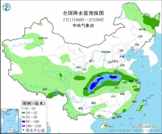 圖5 全國降水量預報圖(6月30日08時-7月1日08時) 圖自中央氣象臺網站