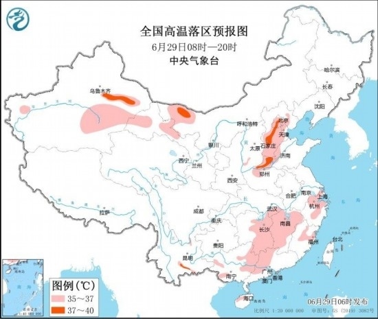 中央氣象臺6月29日06時繼續(xù)發(fā)布高溫黃色預警:預計6月29日白天,北京、天津、河北中南部、河南北部、山東西部、湖南東部、江西、浙江中北部、福建北部、廣西西部和東北部、廣東西北部以及內蒙古西北部、新疆東部、甘肅河西等地的部分地區(qū)有35~37℃高溫天氣,其中,河北中南部、河南北部、新疆吐魯番盆地等地局地最高氣溫可達38~39℃(見圖3)。