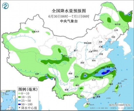 圖4 全國降水量預報圖(6月29日08時-30日08時) 圖自中央氣象臺網站