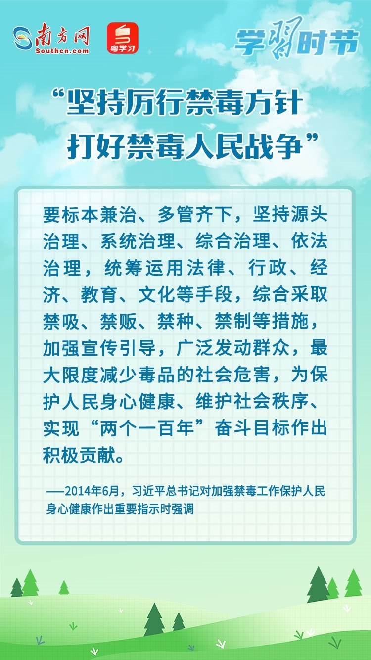 毒品一日不絕,禁毒一刻不止。今年6月26日是第36個國際禁毒日,讓我們在深入學(xué)習(xí)習(xí)近平總書記的重要論述中,不斷增強禁毒意識和防范能力,掌握禁毒工作的深刻意義,堅定打贏禁毒人民戰(zhàn)爭的信心和決心。
