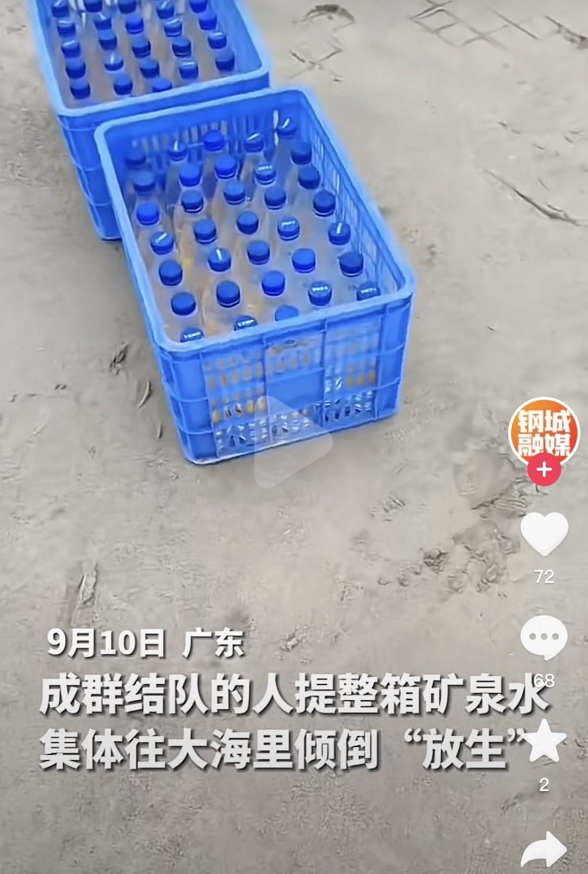 近日,有網(wǎng)友在社交平臺(tái)發(fā)布稱,廣東汕尾湖東港有一群人往海里“放生”礦泉水,60多箱礦泉水被浪費(fèi)?,F(xiàn)場視頻顯示,一群人抬著藍(lán)色的箱子正往海邊走,箱子里可見擺放整齊的礦泉水瓶。視頻發(fā)布者介紹,9月10日下午3點(diǎn)多來了兩輛大巴,大巴上坐滿了人。