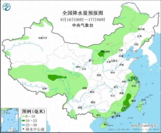 全國(guó)降水量預(yù)報(bào)圖(9月14日08時(shí)-15日08時(shí))