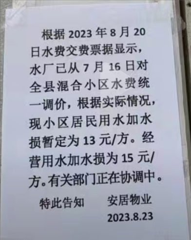 上述網(wǎng)民在《民生熱線》上投訴:“白水縣全縣小區(qū)水費(fèi)上調(diào),最少的12.6元/方,還有15元/方,以前需7元/方,為什么翻倍漲價(jià)?”同時(shí),該網(wǎng)民還列出兩張自來水價(jià)格調(diào)整的通知。