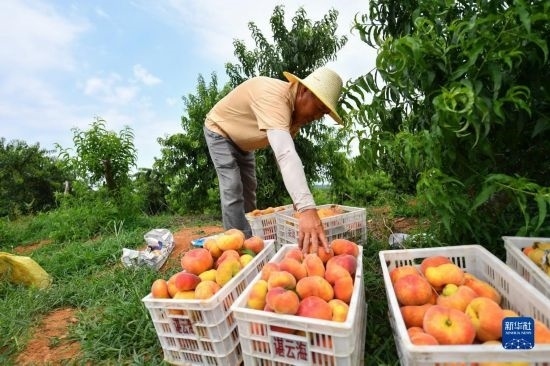 7月7日,在臨湘市聶市鎮(zhèn)乘嶺社區(qū)的涓湖果園,果農(nóng)在采摘蟠桃。