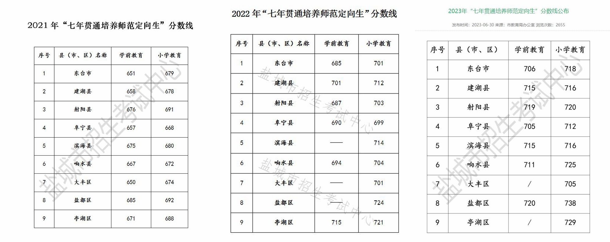 根據(jù)鹽城市教育局公布的2021年-2023年“七年貫通培養(yǎng)師范定向生”分?jǐn)?shù)線來看,該項目的錄取分?jǐn)?shù)線也在逐年升高。學(xué)前教育專業(yè)錄取分?jǐn)?shù)線從最高685分升至最高720分,小學(xué)教育專業(yè)錄取分?jǐn)?shù)線從最高692升至最高738分。