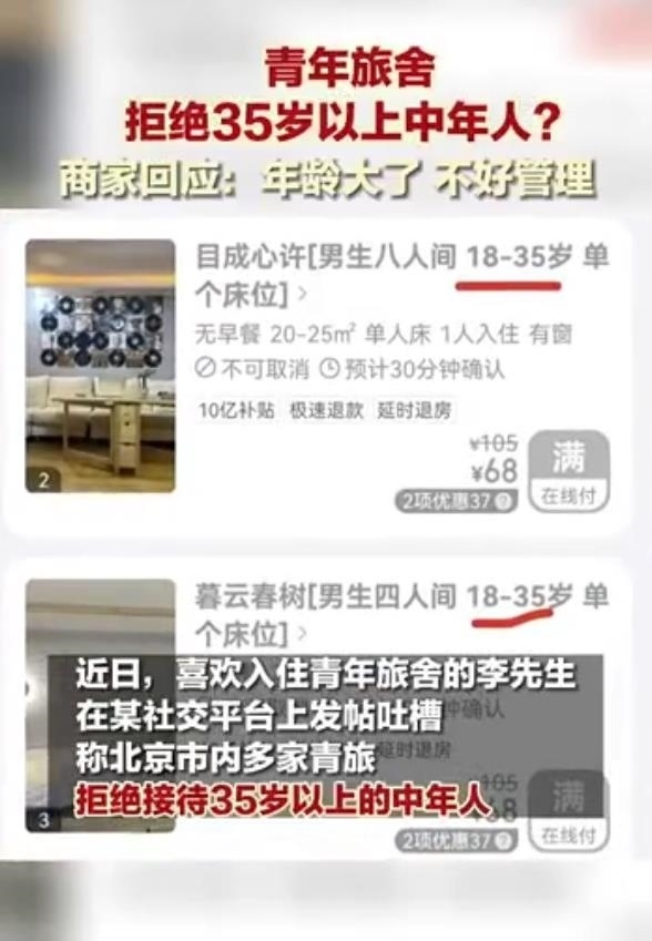 近日,#青旅不接待35歲以上人群#話題沖上熱搜,引發(fā)熱議。該話題源于一網(wǎng)友發(fā)布的帖子。該帖子表示,某平臺(tái)上北京不少青旅商家拒絕年齡35歲以上的人群入住。該網(wǎng)友詢問原因,得到的回答是“年齡大的上下床不安全容易出事。”對此答復(fù),不少網(wǎng)友不能認(rèn)同,認(rèn)為是“借口”。