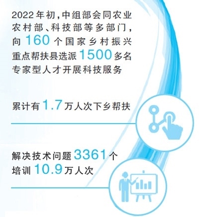 2022年初,中組部會同農(nóng)業(yè)農(nóng)村部、科技部等多部門,以“一縣一團”方式,向160個國家鄉(xiāng)村振興重點幫扶縣選派1500多名專家型科技支撐人才,精準開展科技服務(wù)和人才培養(yǎng)幫帶。