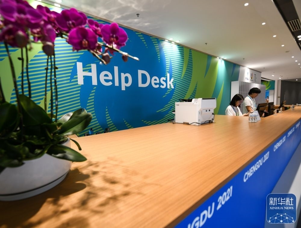 ↑7月13日,在成都大運會主媒體中心,工作人員正在服務臺工作。新華社記者 王曦 攝
