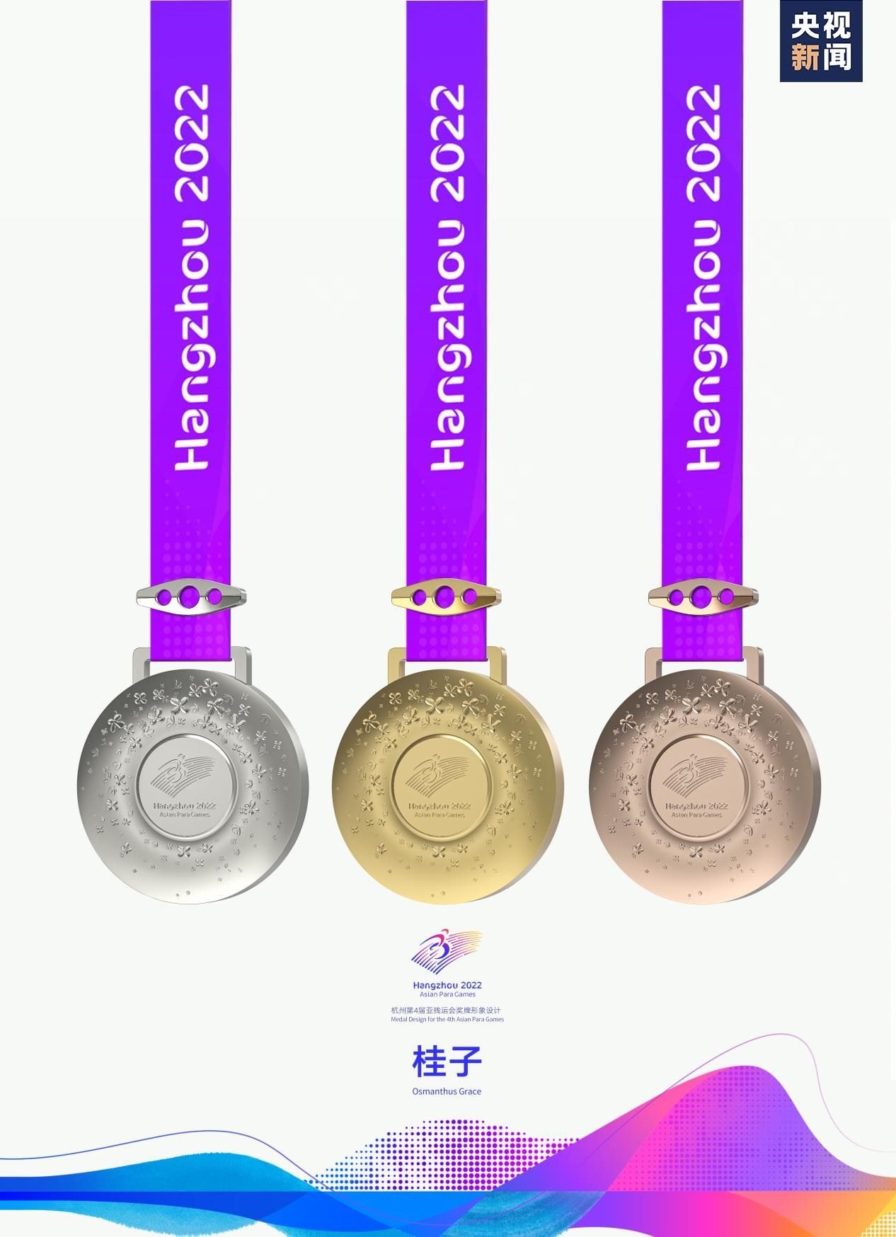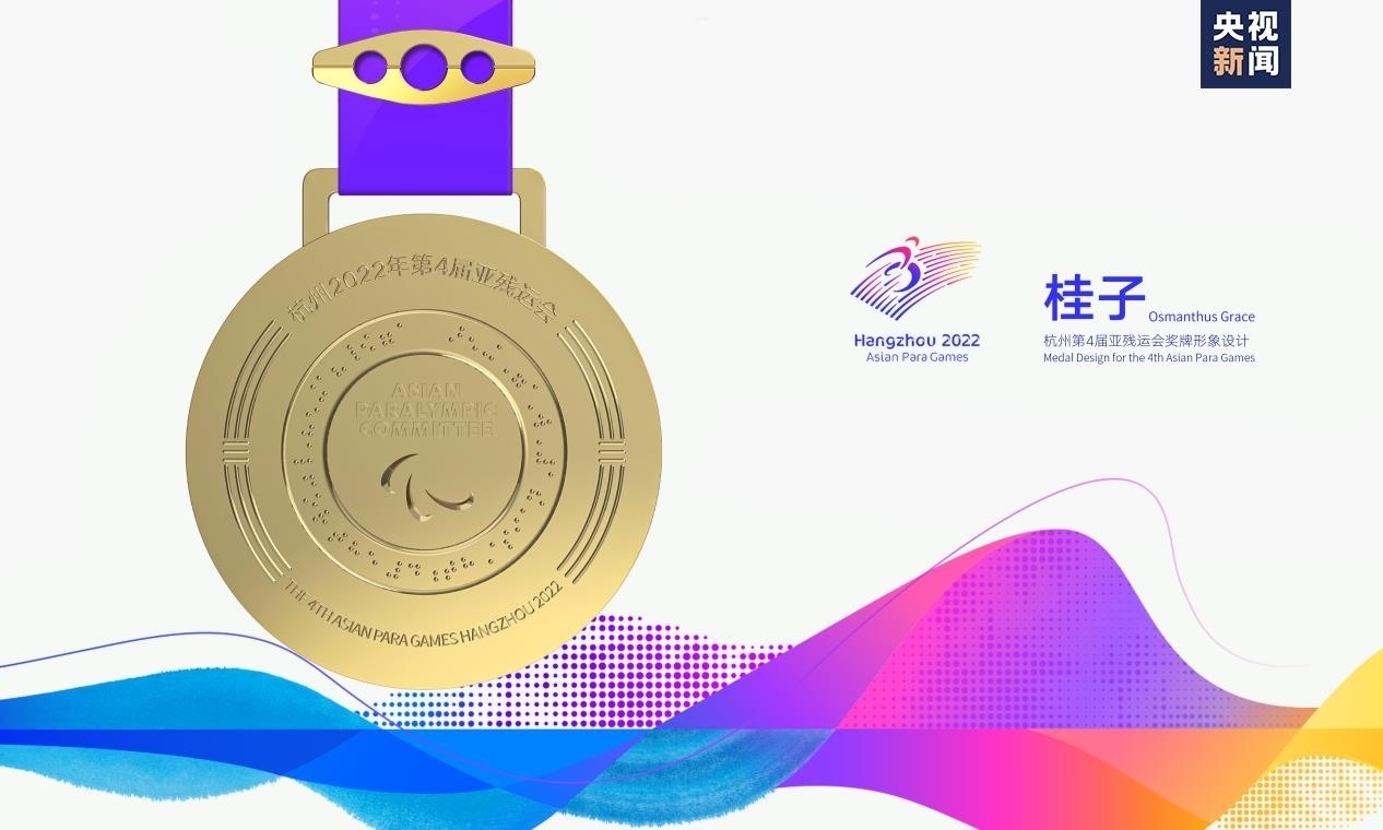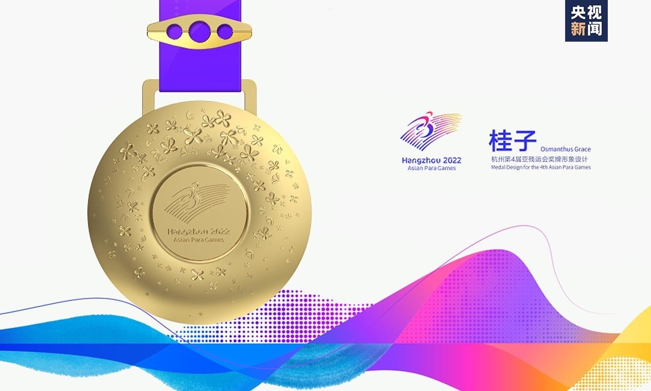 獎牌取名為“桂子”,源自描寫杭州的名句“山寺月中尋桂子”,寓含江南意境和浪漫色彩。系繼會徽“向前”,吉祥物“飛飛”,色彩系統(tǒng)“潤澤”,火炬“桂冠”后又一杭州亞殘運會視覺形象體系的核心元素,是亞殘運文化美學(xué)的重要表達(dá)。