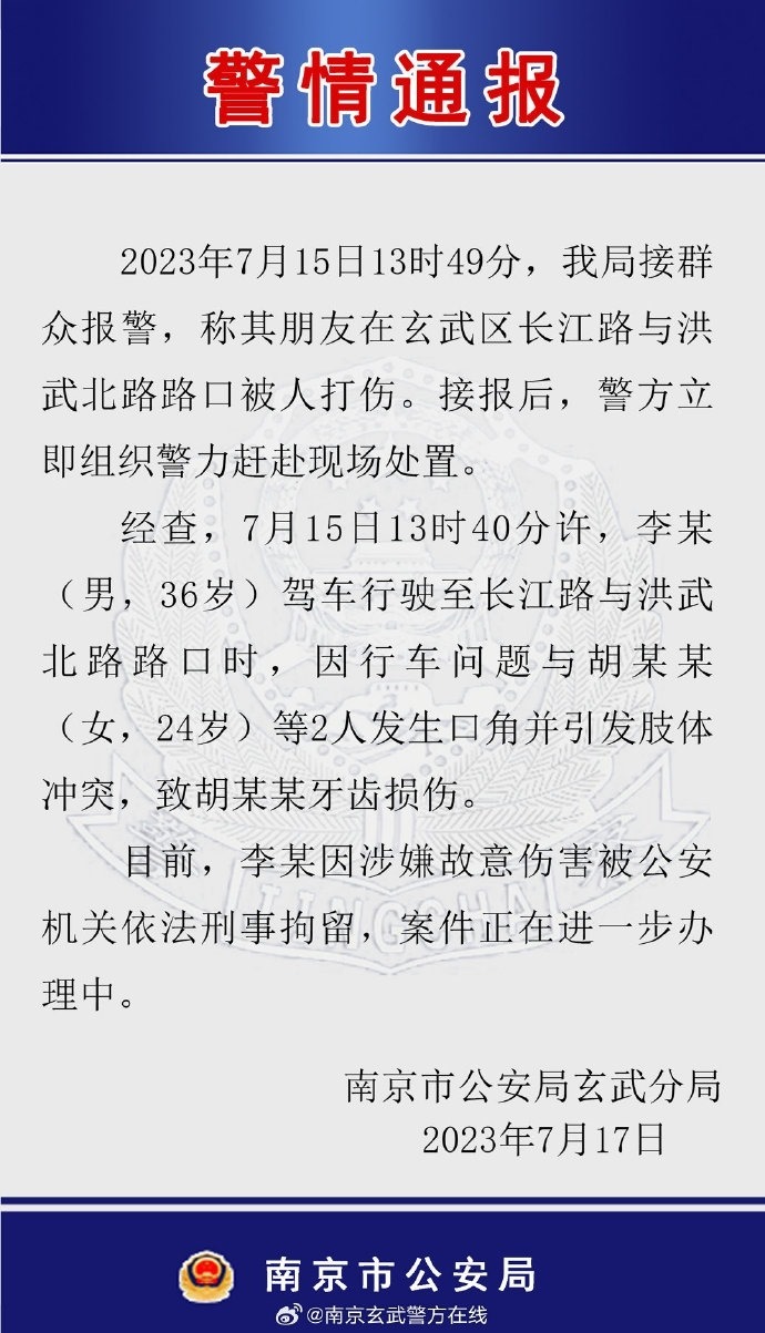 ·警方通報(bào)南京街頭怒路打斗:被打女子牙齒損傷,打人者被刑拘。