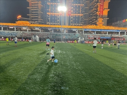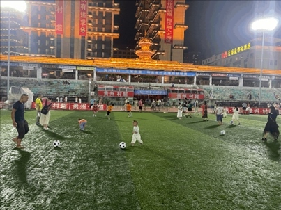 在比賽間隙和結(jié)束后,觀眾席上的孩子們會(huì)沖進(jìn)球場(chǎng),玩起傳球、盤(pán)帶和射門(mén);工作日的晚上,“村超”體育場(chǎng)上,有很多踢球的身影,有中學(xué)足球隊(duì)的隊(duì)員,有八九歲的小學(xué)生,還有剛剛學(xué)會(huì)走路的小朋友。