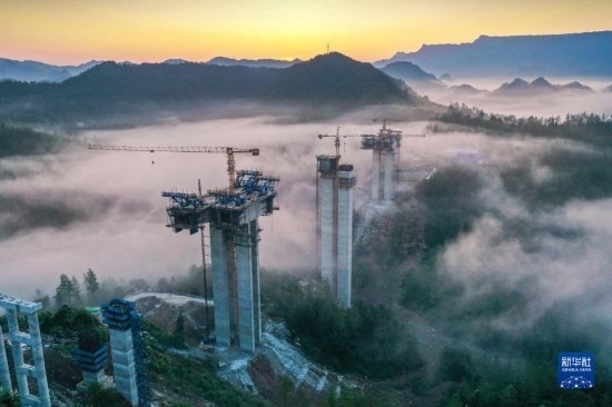 8月4日在湖南省湘西土家族苗族自治州龍山縣拍攝的桑龍高速公路灣檔河特大橋施工現(xiàn)場(chǎng)(無(wú)人機(jī)照片)。