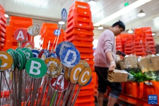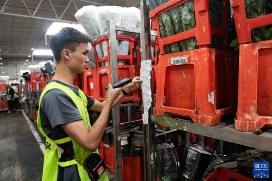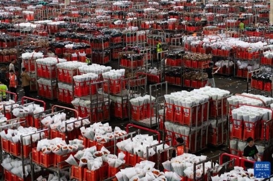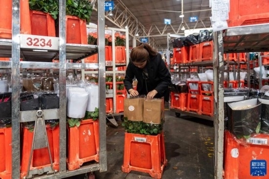 一名工作人員在昆明國際花卉拍賣交易中心內(nèi)對臺(tái)車上存放的鮮花進(jìn)行掃碼(7月13日攝)。新華社記者 陳欣波 攝