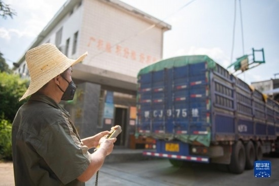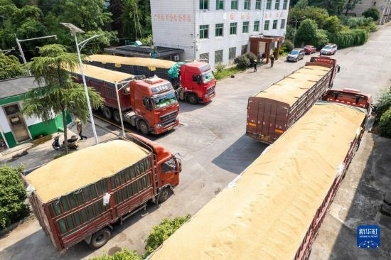 8月7日,運(yùn)糧車在湖南安仁國家糧食儲備庫排隊(duì)過磅(無人機(jī)照片)。