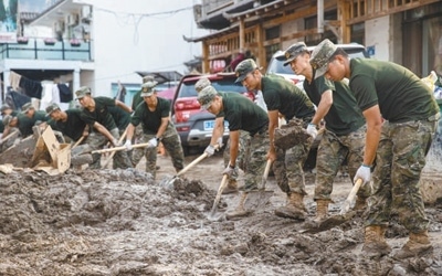 8月8日,武警河北總隊保定支隊組織突擊隊在河北省淶水縣清理淤泥。本報記者 張武軍攝