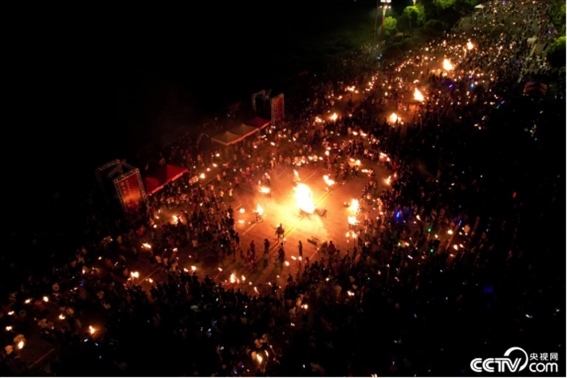 2023年8月10日,云南楚雄舉行中國·楚雄2023年彝族火把節(jié)活動,游客與當?shù)孛癖娨黄饸g慶火把節(jié)。
