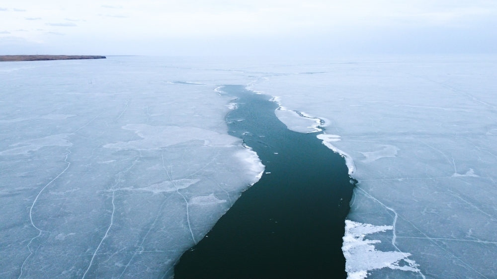這是4月17日拍攝的呼倫湖開湖景象(無人機(jī)照片)。新華社記者 王楷焱 攝