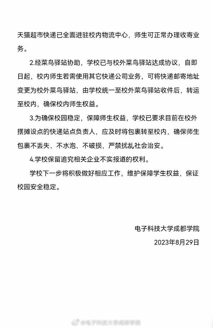 央視網(wǎng)消息:@電子科技大學(xué)成都學(xué)院 微博8月29日就網(wǎng)傳“成都一高校拒絕快遞進(jìn)校”發(fā)布情況說明。其中表示,目前,中國郵政、京東快遞、順豐快遞三家快遞企業(yè)以及天貓超市快遞已全面進(jìn)駐校內(nèi)物流中心。