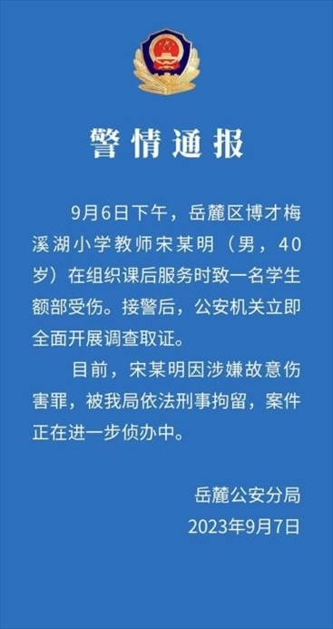 ·長沙岳麓警方:打傷學(xué)生老師涉嫌故意傷害罪被刑拘。此前,長沙岳麓區(qū)教育局通報(bào):該校黨總支書記和涉事教師停職。