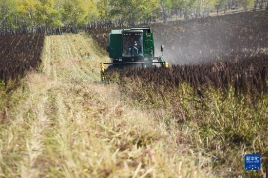 10月1日,在沽源縣白土窯鄉(xiāng)小西溝村,當?shù)剞r(nóng)機手在操作收割機收獲藜麥。