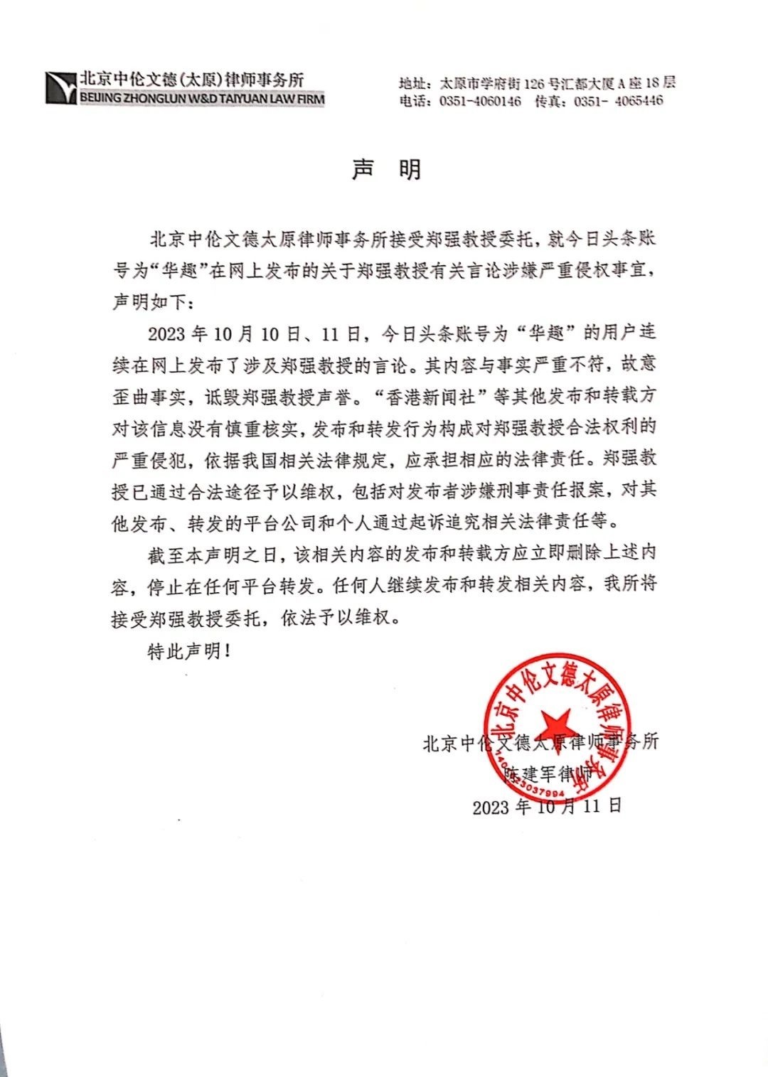 同時(shí),北京中倫文德太原律師事務(wù)所接受鄭強(qiáng)教授委托發(fā)表聲明,稱將依法予以維權(quán)。