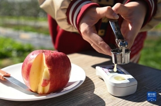10月20日,西北農(nóng)林科技大學(xué)科研人員在洛川蘋果試驗(yàn)站檢測蘋果品質(zhì)。