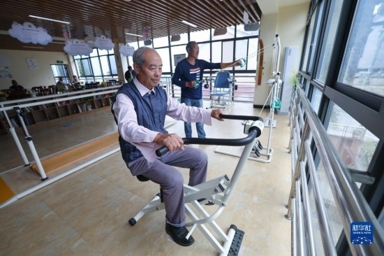 10月26日,在杭州市富陽(yáng)區(qū)湖源鄉(xiāng)居家養(yǎng)老服務(wù)中心,老人們使用健身器材鍛煉身體。
