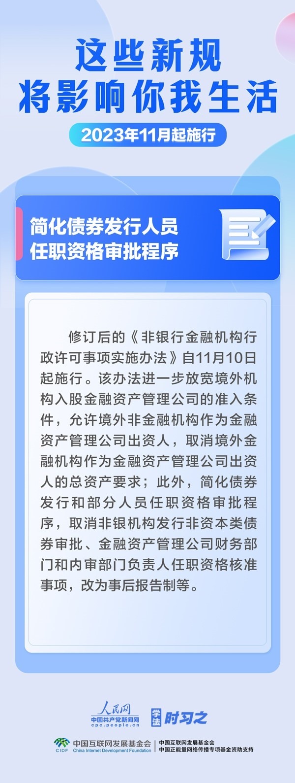 調(diào)整最高法知產(chǎn)法庭審理上訴案件范圍;簡(jiǎn)化債券發(fā)行人員任職資格審批程序;取消出口貨物原產(chǎn)地企業(yè)備案事項(xiàng)……11月,這些新規(guī)施行,將影響你我生活。