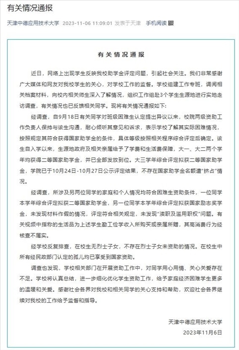 ·天津中德應用技術(shù)大學通報助學金事件調(diào)查結(jié)果:不存在國家助學金名額遭“擠占”情況。