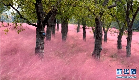近日,在安徽省阜陽市泉河濕地景觀帶,大片粉黛亂子草進入最佳觀賞期。粉色的花海如云似霧,夢幻唯美。
