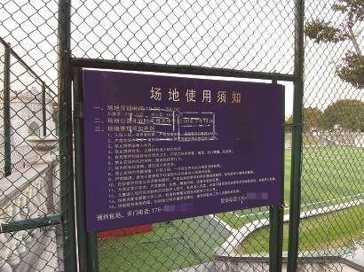 賢園足球場(chǎng)的“場(chǎng)地使用須知”牌。從上面羅列的條款得知,該球場(chǎng)僅中午12時(shí)至下午2時(shí)是公益免費(fèi)開(kāi)放時(shí)段。?