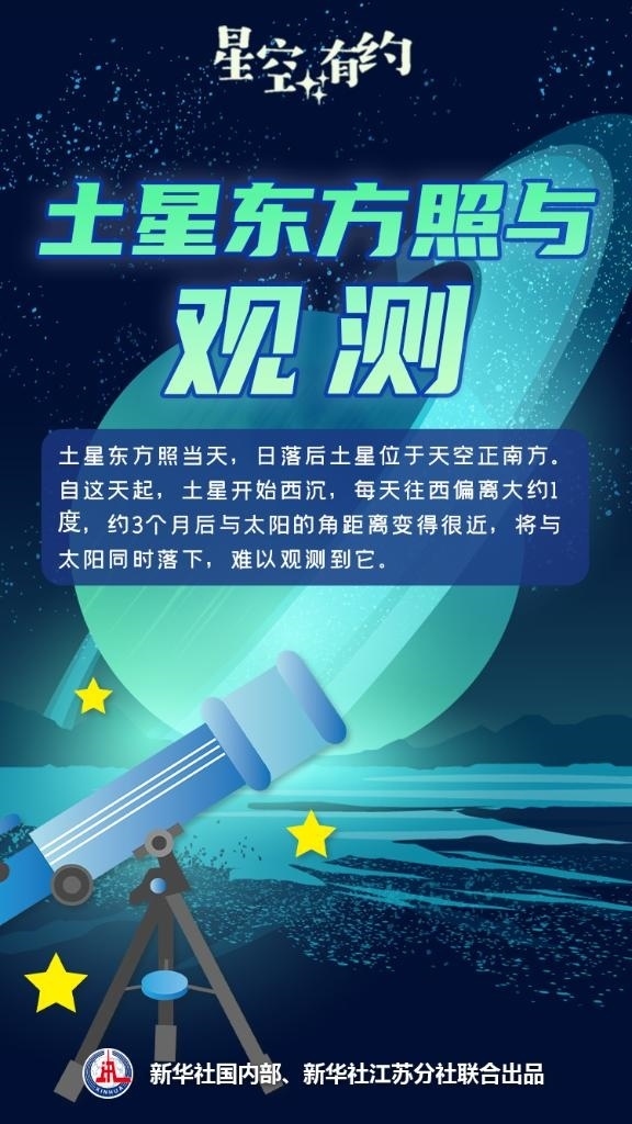 新華社南京11月21日電(記者王玨玢、邱冰清)11月23日17時(shí)47分迎來(lái)土星東方照,屆時(shí)土星將位于天空正南方。土星東方照后的一段時(shí)間,土星觀賞條件會(huì)逐漸變差,直至完全不可見(jiàn)。到下一次沖日前后,又迎來(lái)下一個(gè)土星觀賞的最佳時(shí)機(jī)。什么是土星東方照?它和土星沖日時(shí)看到的土星有什么區(qū)別?天文科普專家為您揭秘。