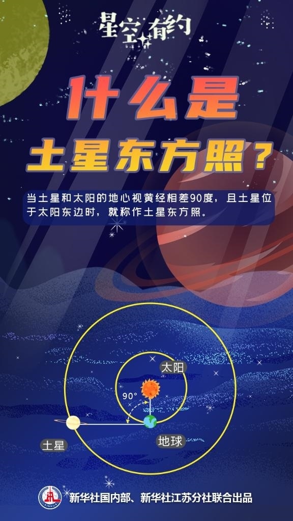 當(dāng)土星和太陽(yáng)的地心視黃經(jīng)相差90度,且土星位于太陽(yáng)東邊時(shí),就稱作土星東方照。如果可以俯視太陽(yáng)系的平面,此時(shí)你會(huì)看到太陽(yáng)、地球、土星形成了一個(gè)直角,地球處于直角的頂點(diǎn)。