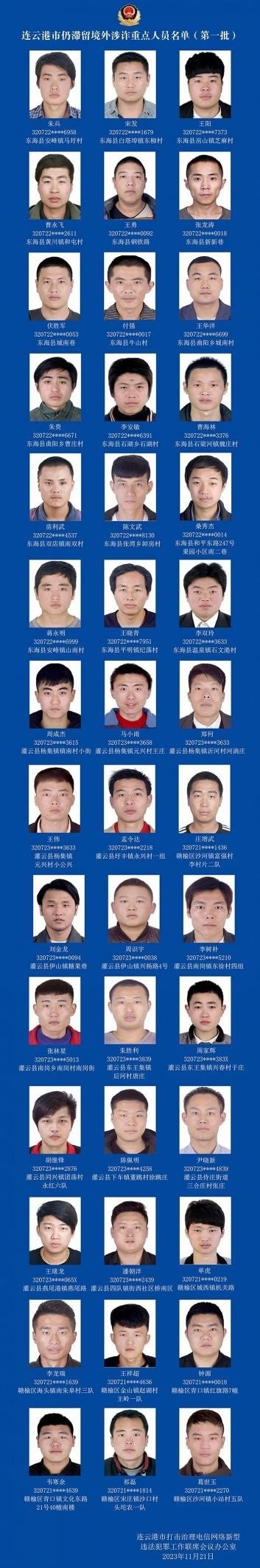 ·江蘇連云港警方發(fā)布首批42名非法滯留境外涉詐重點人員名單,要求滯留人員主動于2023年12月20日前通過正規(guī)渠道入境回國,并在入境前向戶籍地派出所報備。對于拒不回國投案自首的,司法機關(guān)將依法嚴懲。