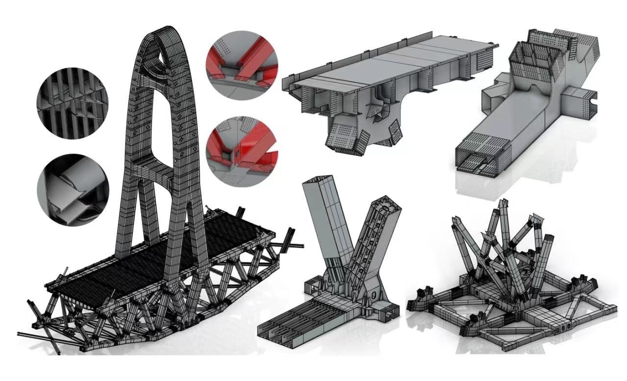 “本橋曲線鋼桁梁構造異常復雜,鋼塔外形為半橢圓變截面,桁架近萬根桿件空間定位要求嚴絲合縫。為了準確表達每個細節(jié),我們采用了BIM正向設計思路,探索出設計—建模—成圖一體化的設計流程,開發(fā)出自動化建模功能和智能化出圖系統(tǒng),為施工企業(yè)和鋼梁制造廠提供高精度的模型和批量圖紙,精準表達復雜的結構信息和設計意圖,打通了設計—制造—施工全過程信息傳遞路徑,有效節(jié)約了工期與造價?!敝需F設計集團大橋項目主管總工彭嵐平向我們講述了大橋采用的最新智能化設計手段。