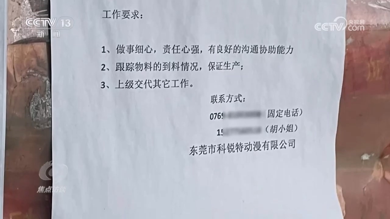 隨后,記者在佳輝公司的門口看到了幾張招工啟示,其中一張的招工單位落款正是科銳特公司,看來,兩家公司必定有所關(guān)聯(lián)。于是,記者想辦法再次進(jìn)入到了“佳輝”的生產(chǎn)車間,發(fā)現(xiàn)工人們正在生產(chǎn)所謂的“美少女”手辦的組合部件。
