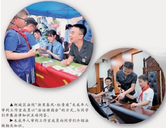 在法治教育課程上,柯城區(qū)法院根據(jù)轄區(qū)學(xué)校數(shù)量多、階段全的情況,在9所試點學(xué)校設(shè)立“紅青庭”校園法治輔導(dǎo)站,分別選任9名法治輔導(dǎo)員和9名法治宣傳員,根據(jù)未成年人身心特點,協(xié)助創(chuàng)新法治教育課程內(nèi)容和形式,已就反詐、防性侵等內(nèi)容開展模擬法庭、情景劇等活動12次。