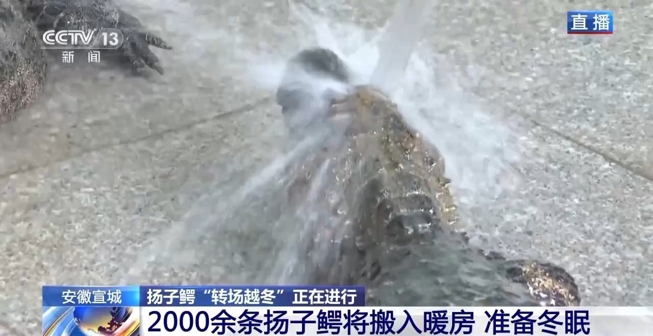 由于今年的溫度比較高,與往年相比,轉(zhuǎn)場(chǎng)越冬推遲了十天左右。轉(zhuǎn)場(chǎng)是按照從小到大的順序。今天是第一天,率先搬家的主要是7歲以下的幼鱷,它們對(duì)環(huán)境的適應(yīng)能力更弱一些,需要盡快搬進(jìn)室內(nèi)。在搬進(jìn)暖房之前,揚(yáng)子鱷需要先進(jìn)行沖洗、消毒。“安家”后,越冬房的溫度會(huì)保持在10℃左右,并且有工作人員定期打掃、保濕,確保揚(yáng)子鱷安全過冬。
