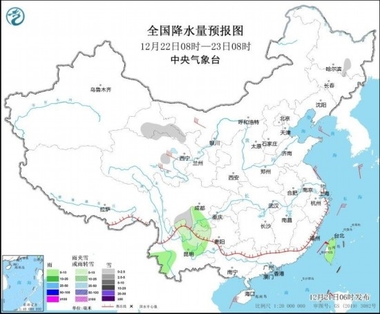 12月22日08時至23日08時,山東半島、青海北部和東部、甘肅河西、四川南部、貴州西北部、云南東北部等地部分地區(qū)有小雪或雨夾雪,其中,山東半島北部等地部分地區(qū)有中雪。四川盆地南部、云南西南部和中部、臺灣島大部等地部分地區(qū)有小雨。內(nèi)蒙古西部、青海東部和南部等地部分地區(qū)有5~7級風(fēng)(見圖4)。