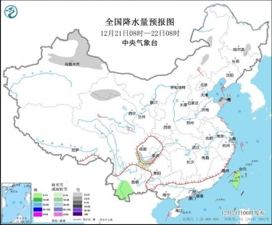 12月21日08時至22日08時,新疆北部、甘肅河西、黃淮東部等地部分地區(qū)有小雪或雨夾雪,其中,山東半島等地部分地區(qū)有中到大雪,局地暴雪(10~15毫米)。云南西南部和中部、臺灣島等地部分地區(qū)有小雨。內(nèi)蒙古東南部、青海北部、江蘇中部、川西高原北部等地部分地區(qū)有4~6級風(fēng)(見圖3)。