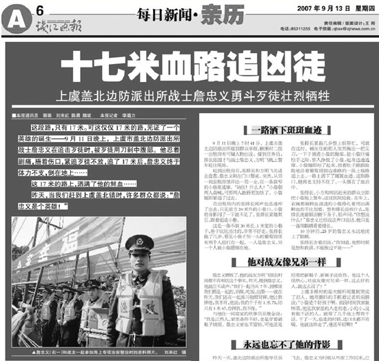 2007年9月13日出版的《錢江晚報(bào)》A6版,報(bào)道了詹忠義烈士的事跡。在題為《十七米血路追兇徒——上虞蓋北邊防派出所戰(zhàn)士詹忠義勇斗歹徒壯烈犧牲》的報(bào)道中寫道: